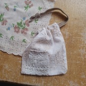 ワンピースの生地を巾着に仕立て、ブラウスに使われていたレースを縫い付けました。