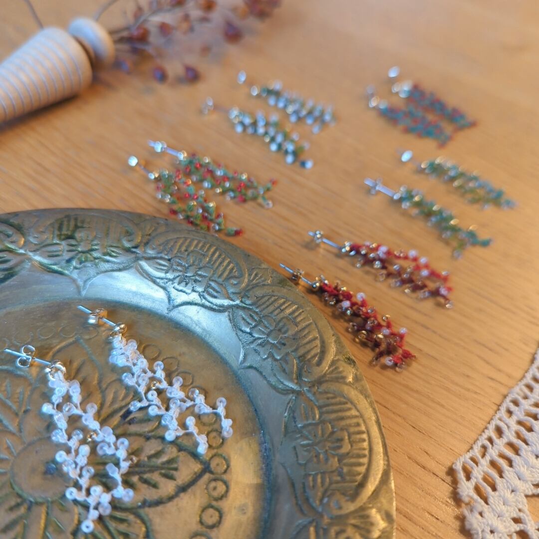 80番糸という細いレース糸にビーズを編み込みながらモチーフをお作りし、耳飾りに仕立てております。