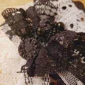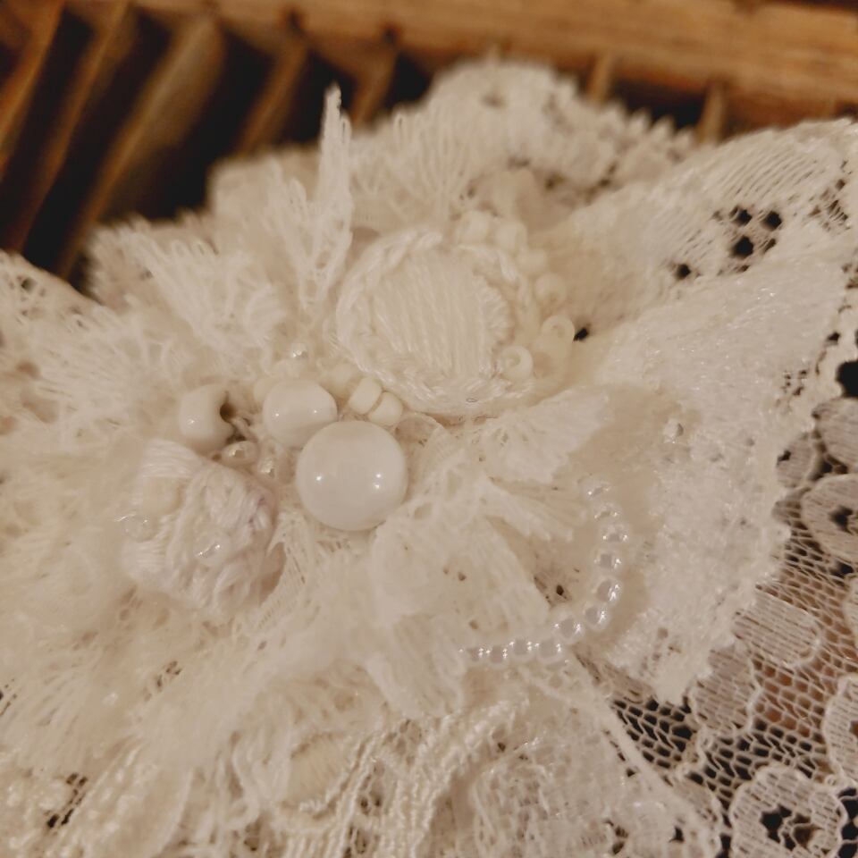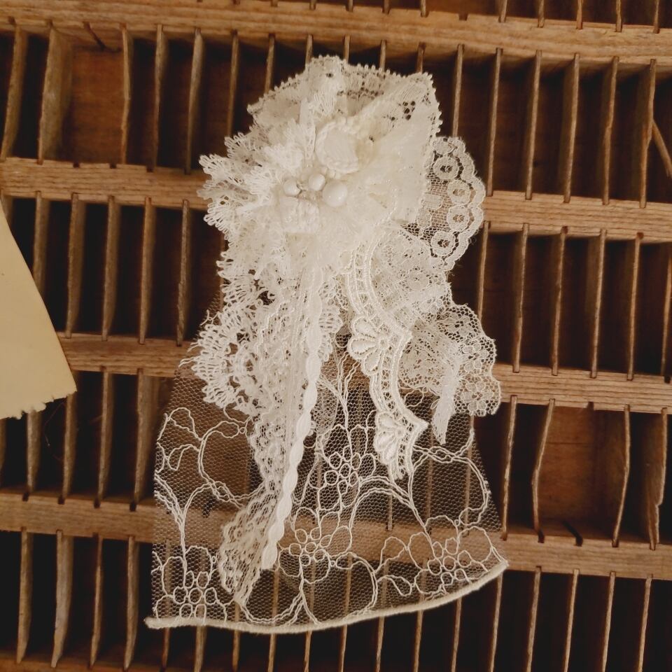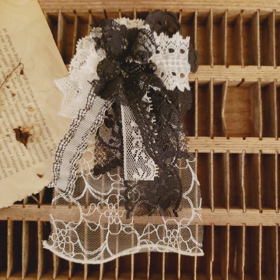 レースをふんだんに使い、刺繍したモチーフを貼っております。